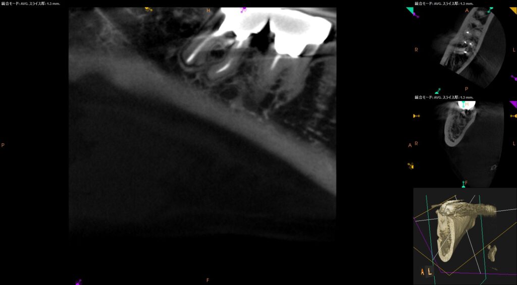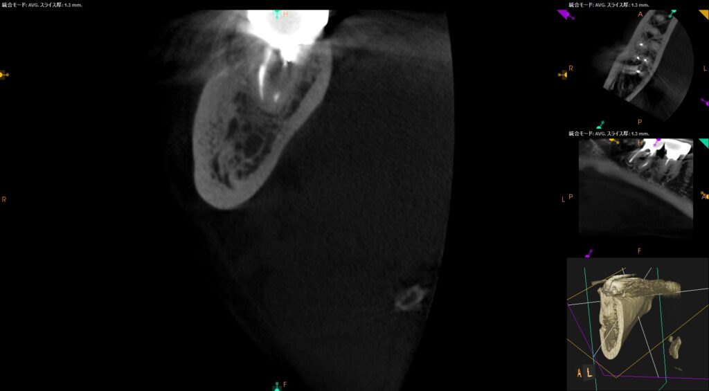 再歯内療法した左下6番の根っこの先の改善しているように見える。(まだ数か月単位なので被曝量も考慮し、歯科用部分CT撮影は行っていません。)