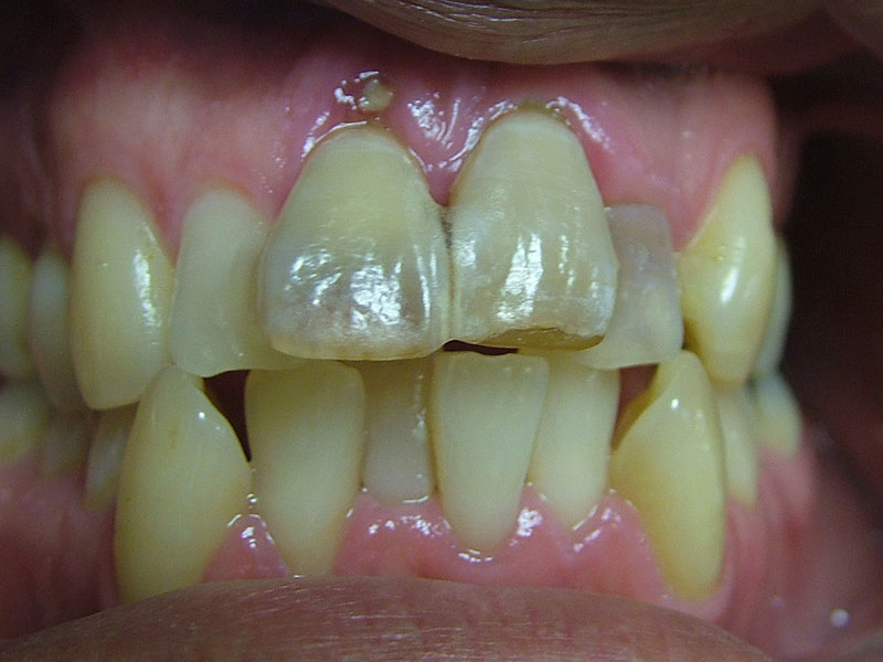 - 主訴:以前に外傷でぶつけた上の前歯が動いてきた。取れそうなので何とかしてほしい。