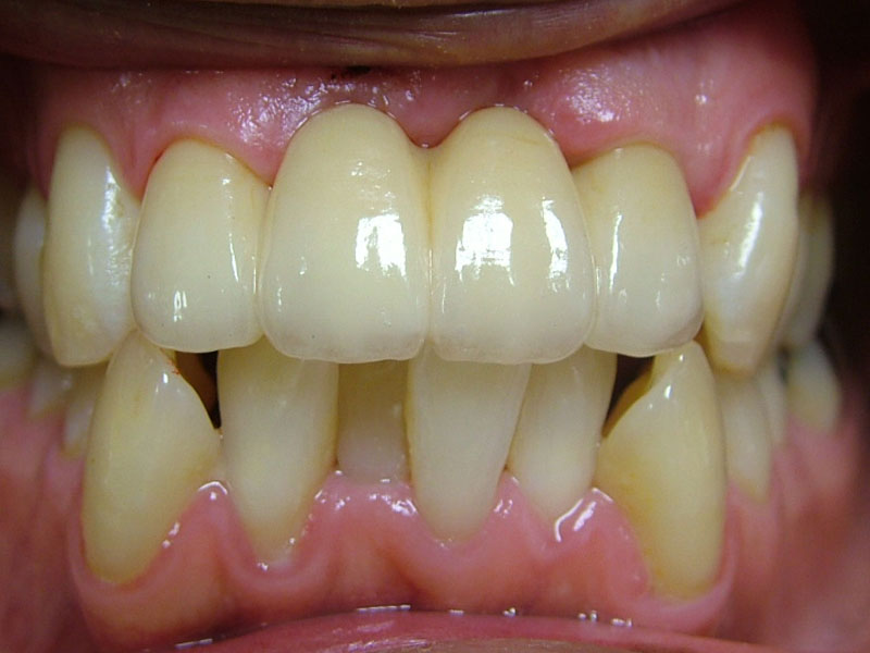 ソケットプリザベーションという、抜歯後の顎骨や歯茎の退縮を予防する処置を行っているため、左上2~右上2までの歯頸ラインがえる程度整っているのがわかります。後は3~4か月メンテナンスを維持して、少しでも永くトラブルが生じないことを願うばかりです。