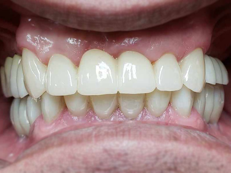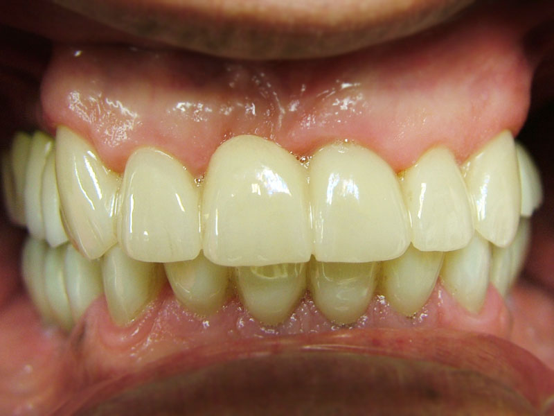治療後3か月に1度の定期検診に移行し、7年の月日が経過しました。幸いジルコニアのチッピング(破損)、歯茎の退縮等の審美面のトラブルや患者さんの不都合も訴えることなく、経過良好と言えます。口の中を綺麗にしたせいか、A1Cの値も落ち着いているとのことです。