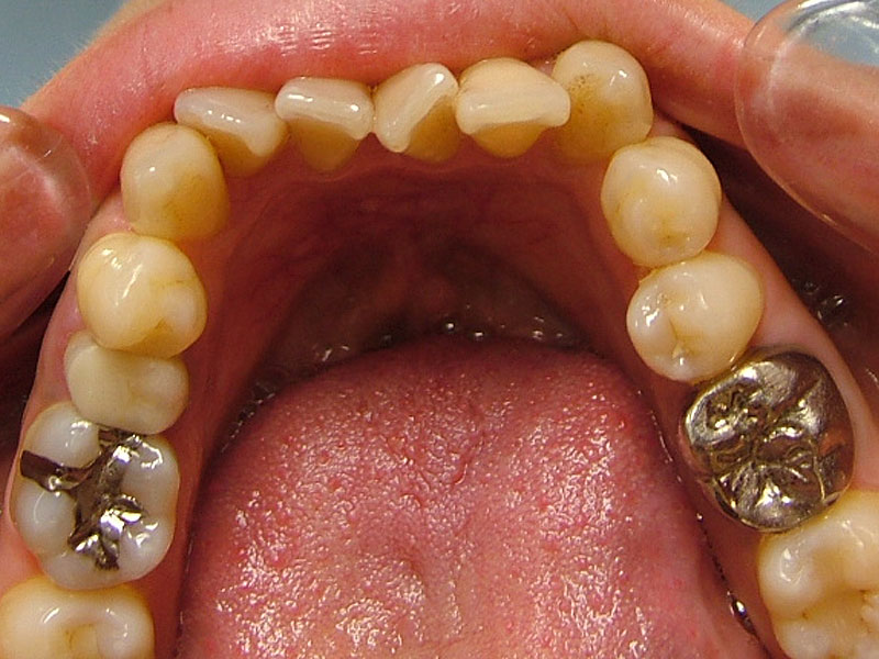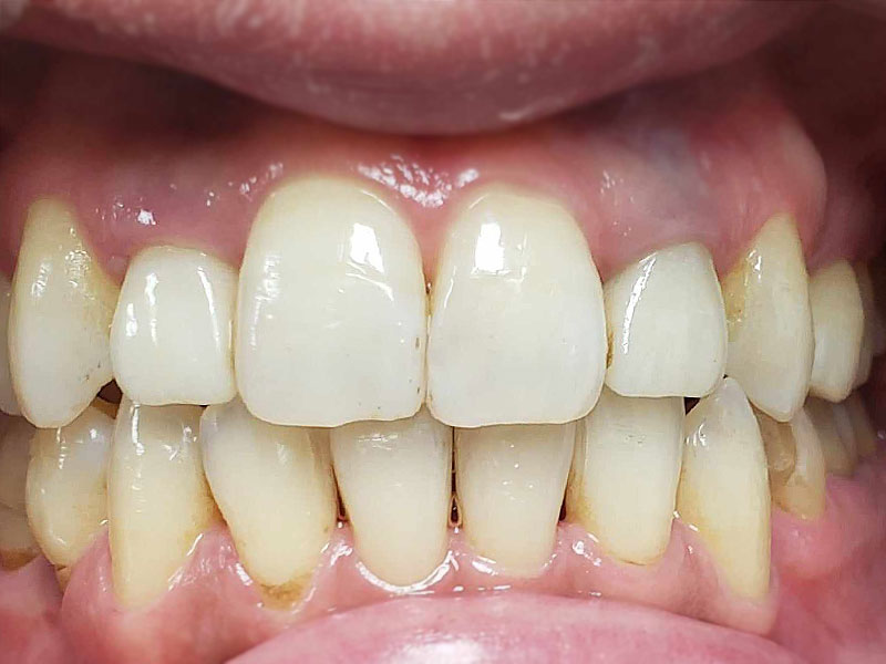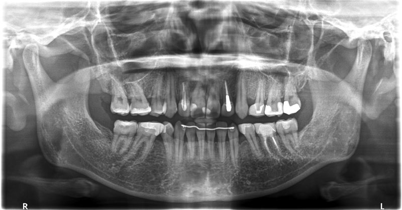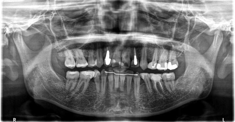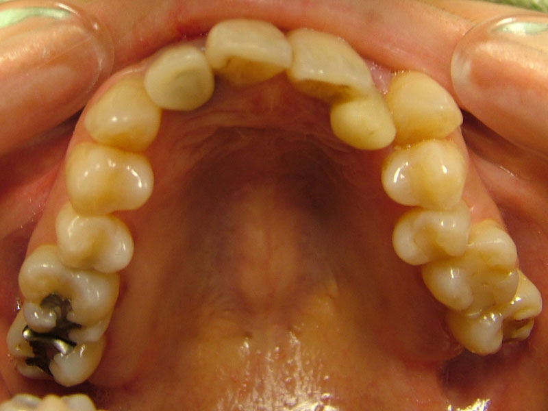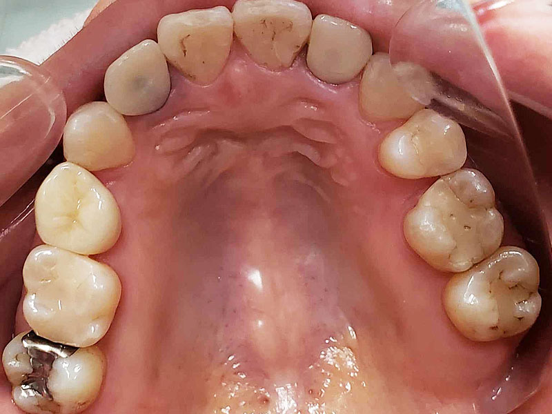 着色は認められますが、ほぼ10年前の状態を維持しているように思えます。着色したCRをセラミックにという考え方もありますが、神経除去のリスクもあるため、患者さんが見た目でどおしてもと希望されないかぎり、個人的にはお勧めしません。この方も希望されませんでしたが、症状を訴えたり、確実に中が虫歯と判断しない限り、このまま経過観察していこうと考えています。