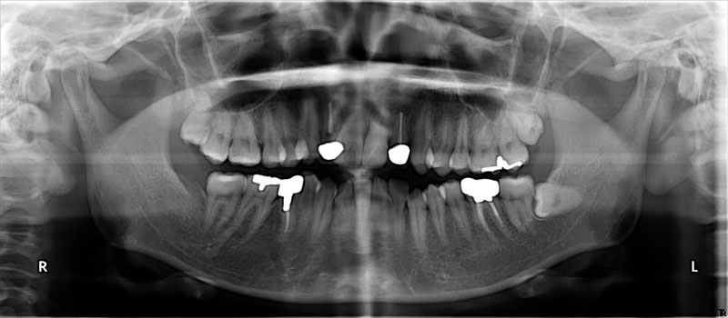 • 治療方針:親知らず3本抜歯、上下小臼歯4本抜歯、矯正用インプラント使用のワイヤー矯正、修復処置、保定(上マウスピース、下ワイヤー)、メンテナンス