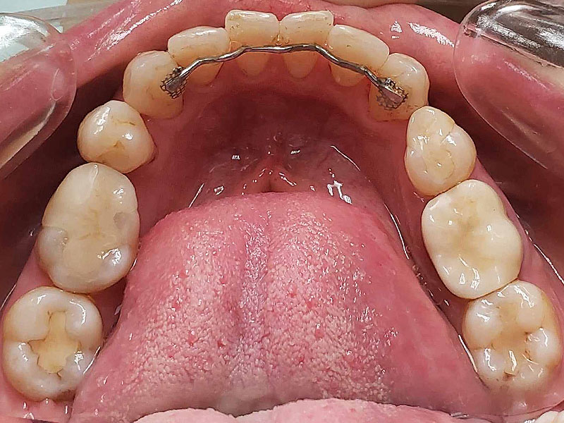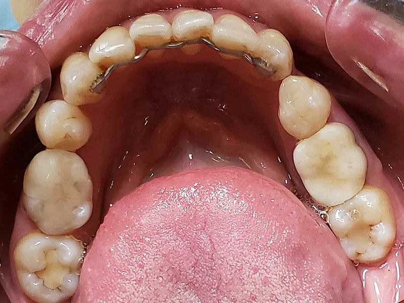 約2年治療期間で包括矯正治療は完結となり、患者さんは大変満足してくれました。更にかみしめ癖も軽減し、肩こりも無くなったとのことです。口腔内写真からも舌房が確保され、舌圧痕がなくなり、かみしめ癖が軽減したことも十分にわかります。